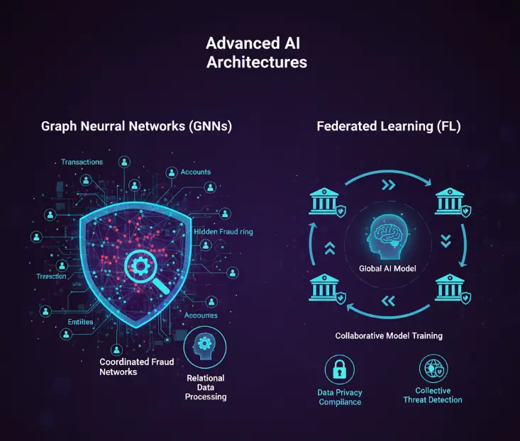 Furthermore, Federated Learning (FL) allows multiple banks to collaboratively train AI models without sharing sensitive raw data. FL enhances collective threat detection, mitigates systemic risk, and ensures compliance with stringent data privacy regulations like GDPR and CCPA. The combined power of GNNs and FL enables banks to fight fraud collectively, ensuring resilience across the financial ecosystem. 🌍🤝