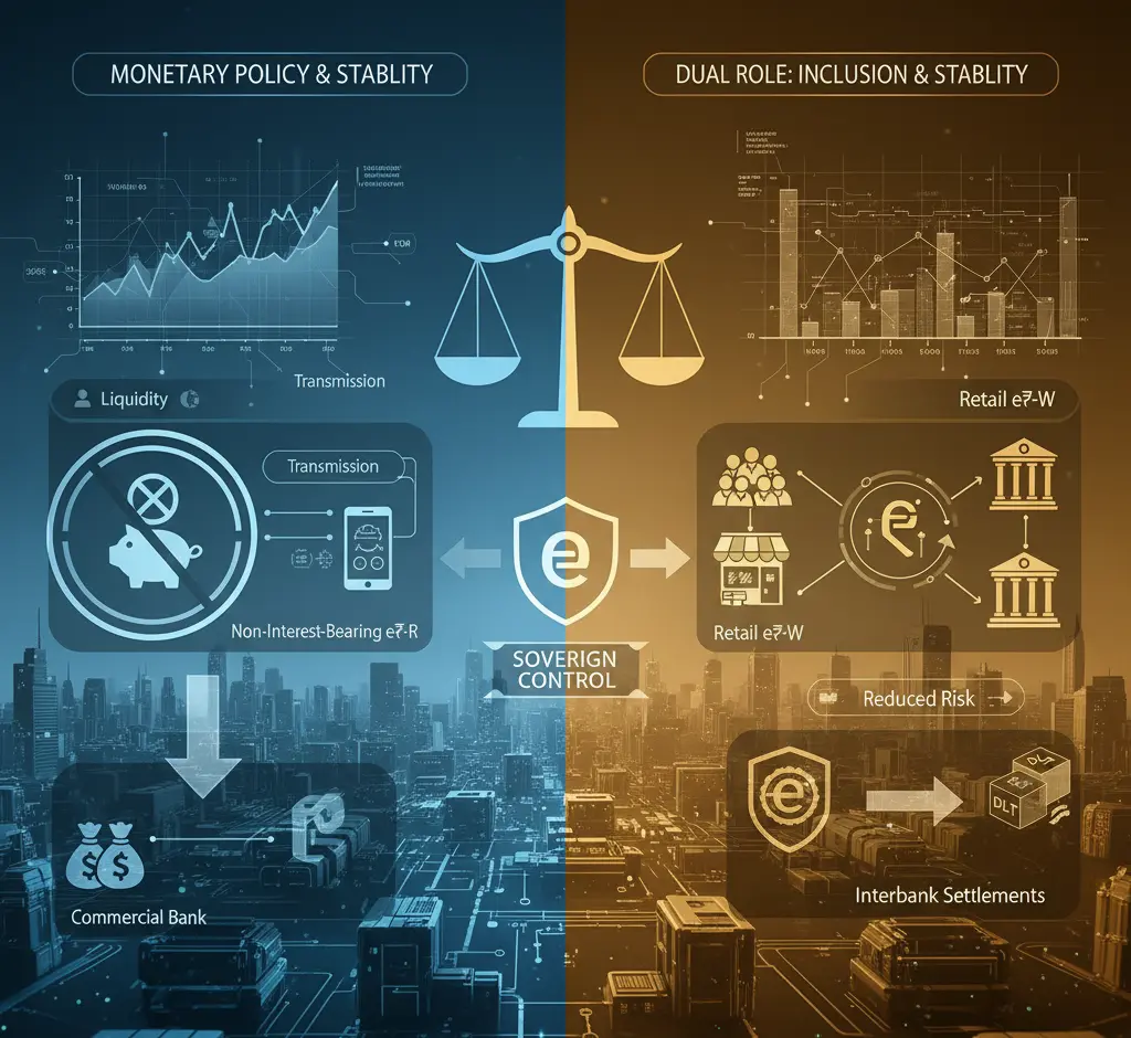 The introduction of a CBDC impacts monetary policy, liquidity, and financial stability. To mitigate risks such as bank disintermediation, the RBI has designed the e₹-R to be non-interest-bearing, discouraging users from moving deposits from commercial banks into e₹. This preserves bank liquidity, ensures monetary policy transmission, and maintains overall system stability.